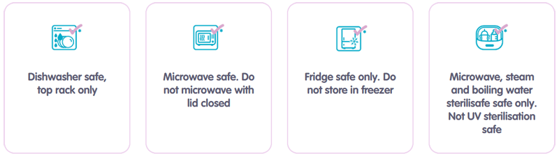 - Care instructions: Dishwasher safe (top rack). Steriliser safe; UV steriliser may cause discolouration. Microwave and freezer safe.