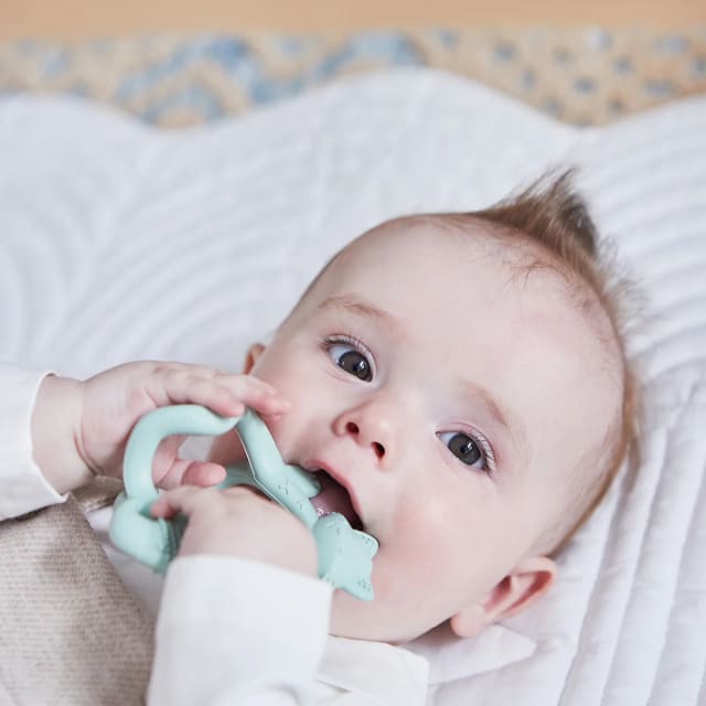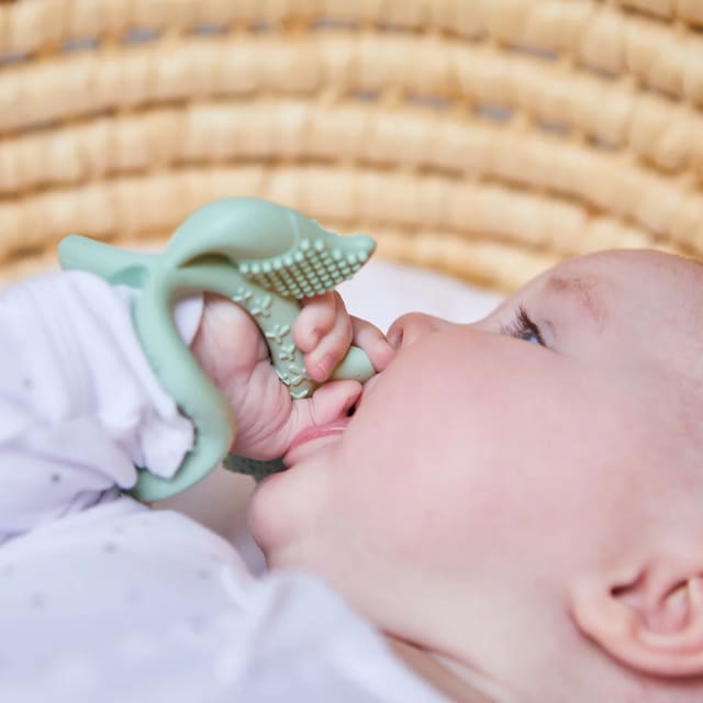 Teething babies love to chew. Introducing the b.box wrist teether. Designed to grasp or wear as a bracelet, the textured design helps to massage sore gums and spark curiosity.